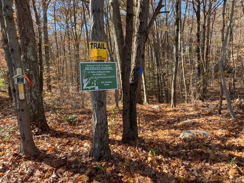 The main trail, the blue-blazed Naugatuck Trail, begins on Farm View Road and follows a watercourse south to the Woodbridge town line, where it connects with a section of the Naugatuck Trail that runs beside Bladen’s Brook to Sanford Road. The West Loop Trail, sections of which are steep, leaves and then reconnects with the Naugatuck Trail. An extension of the Naugatuck Trail heads north from Farm View Road and connects with Town of Bethany's Carrington Preserve.