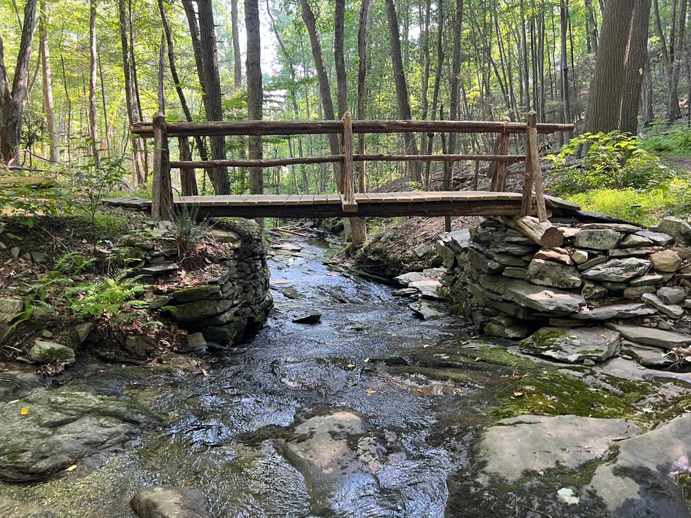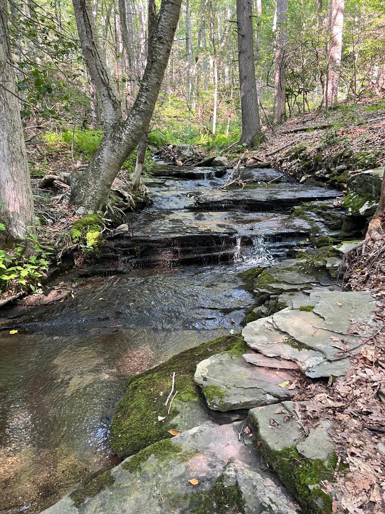 The Blue Trail loop is 3 miles and begins just beyond the parking area and after a short walk, the trail splits. Staying straight is the shorter way to the pond and camping area. The description below is in the order of going right, although it is a loop and can be travelled in either direction. After turning right on the Blue Trail loop, the trail meanders through scenic forests featuring abundant ferns, mountain laurel, and a scenic view of the creek (note: the chairs overlooking the northern creek & waterfall are on private property).