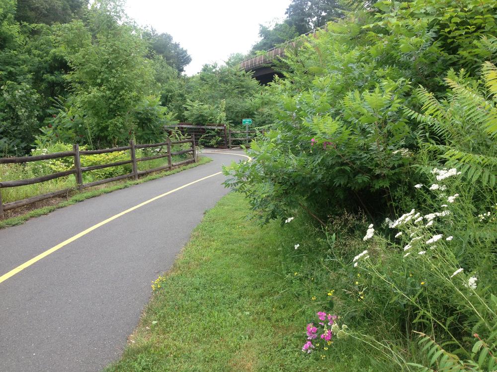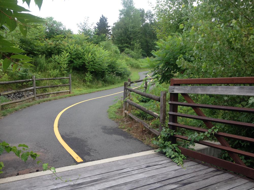 There is a stretch of trail from the entrance to Manchester Community College on Bidwell to the trail entrance just east of 672 Hartford Road which is still sharing the road with motorized vehicles. At this time, the route can be traveled by using a sidewalk for pedestrians and on-street by cyclists. A project is underway to complete this gap.