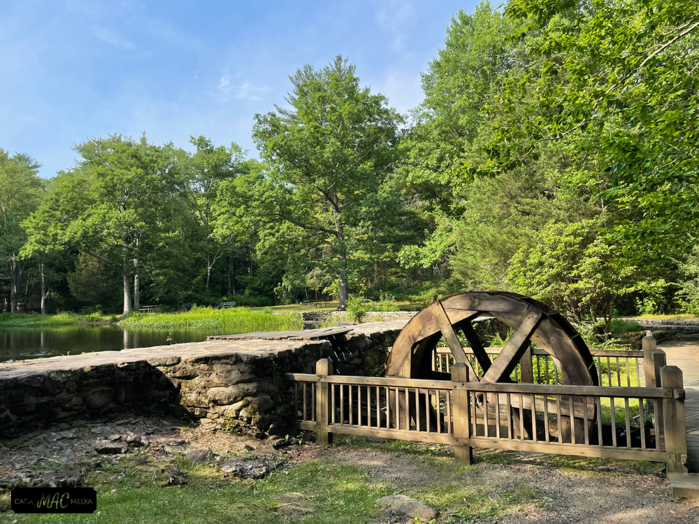 Early settlers made use of the stream for waterpower. Descendants of three Chatfield brothers, who arrived from England about 1639, were believed to have operated a gristmill along the brook. Occasional chunks of oddly shaped metal fragments found near the watercourse are evidence that an iron smelting furnace worked native ores into metal for implements. Other reminders of early history include several old building foundations, a restored waterwheel on the upper pond, and the covered bridge reproduction spanning Chatfield Hollow Brook.