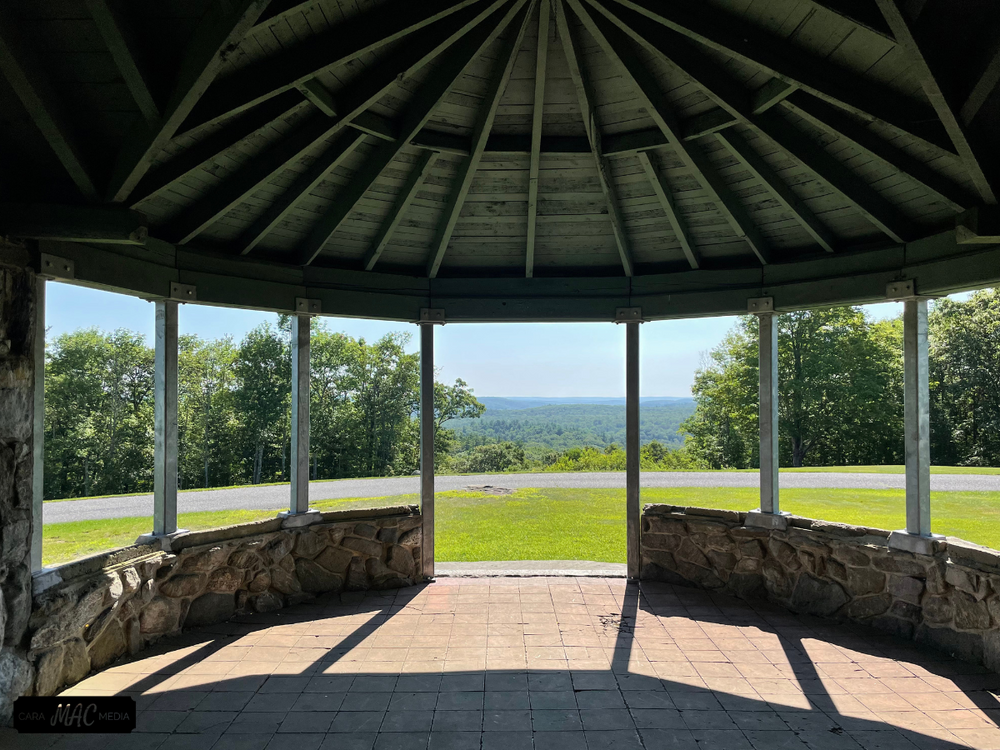 The gently sloping Summit Road can be hiked all year and leads to the top of Dennis Hill, which can also be reached by car from late April to early November. On the summit, a pavilion which formerly served as a summer residence and then a World War II lookout still stands as a landmark and a shelter from which to view the landscape or have a picnic. On a clear day, Haystack Mountain, Mount Greylock, the Green Mountains of Vermont, and even parts of New Hampshire may be visible.