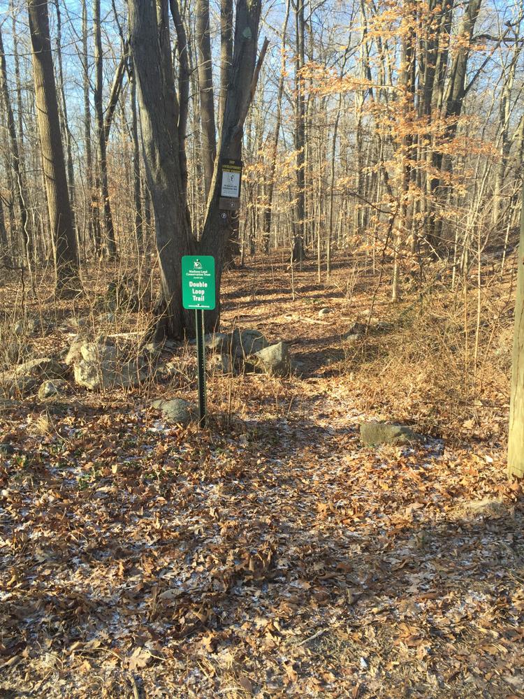 The well-used south path through private land, while not mapped, is blue-blazed and open to public hiking. Eventually, it splits to go either west or east. Turning west, it joins the Indigo Woods Trail, Trail 15 (within a Conservation Easement on private land). To the east it passes first east, then north over a high promontory and then down to Warpas Road, a few hundred yards from Trailhead 1 of the Camp Hadley Trail.