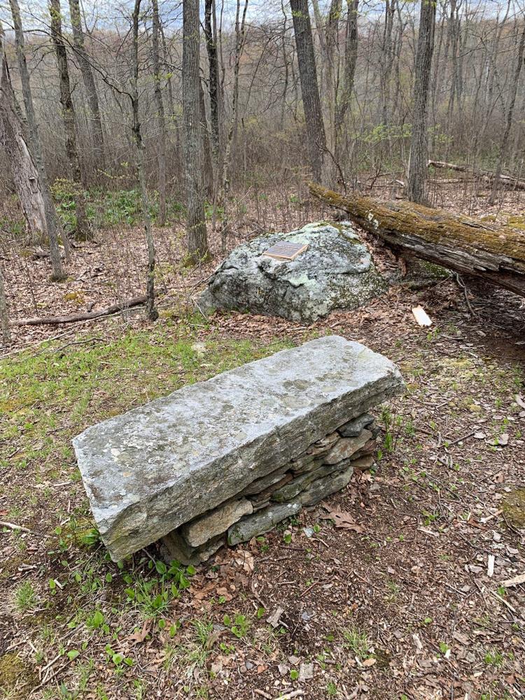 The yellow blazed trail through the woods crosses wetlands on a wooden walkway, then goes on to higher ground, ending in a loop path bordering a stone wall. Just before the wall is a stone bench, placed in memory of Carrick McLaughlin. At the farthest point of the loop it connects with the town of Mansfield’s white-blazed Dunhamtown Forest trails.
