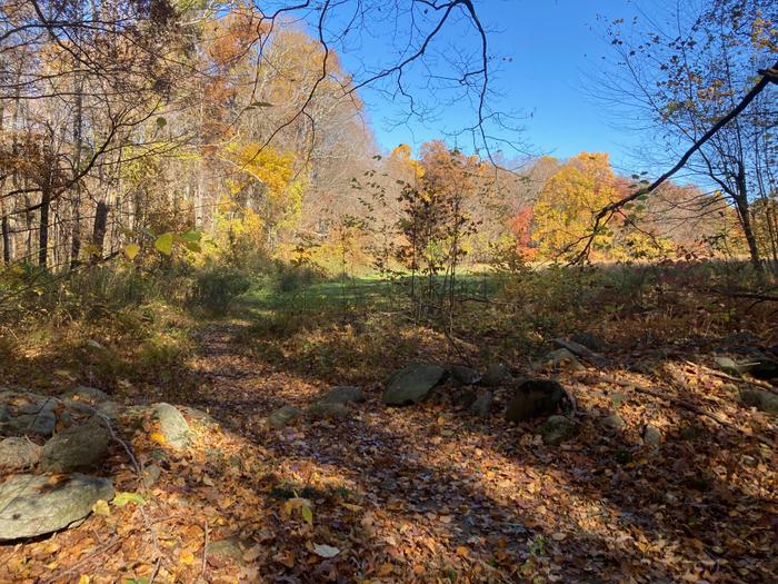 On the southside of the parking lot, entering the woods at the Blue Trail marking and crossing at Beecher Road will lead to the Naugatuck Trail/Woodbridge Greenway and through the Racebrook Estates trail system, out to Pease Road and beyond.