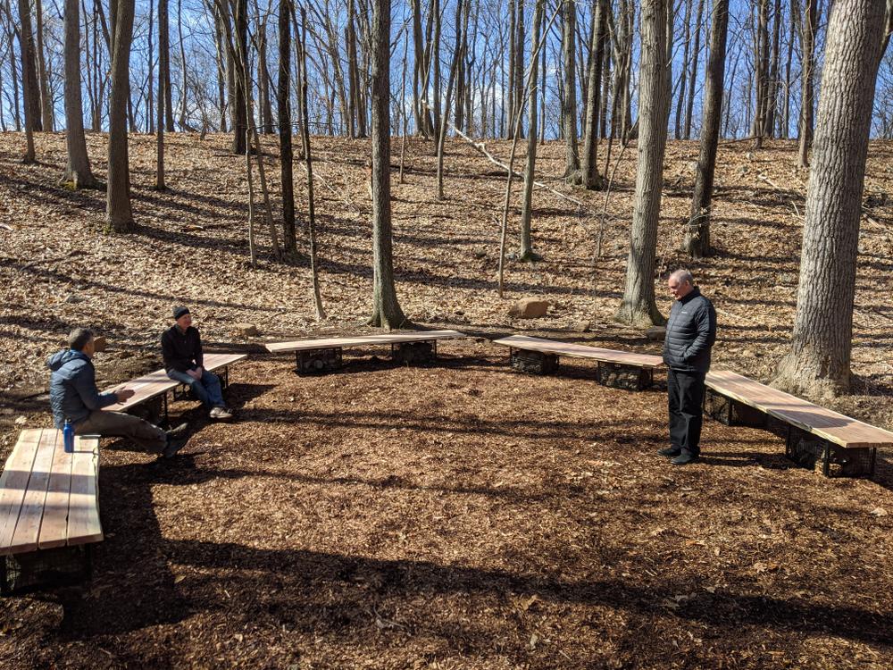 The trails follow many old fire lanes from the time the property was a tree farm and offer multiple loop opportunities. The trails include: Camille's Way - 2.2 miles (main outer loop and blazed blue), Sarah's Path- 0.3 miles (blazed blue/purple), Discovery Loop- 0.2 miles (blazed blue/red), Camelia's Trail- 0.7 miles (blazed blue/orange), Ruth's Crossover- 0.1 miles (blazed blue/green)