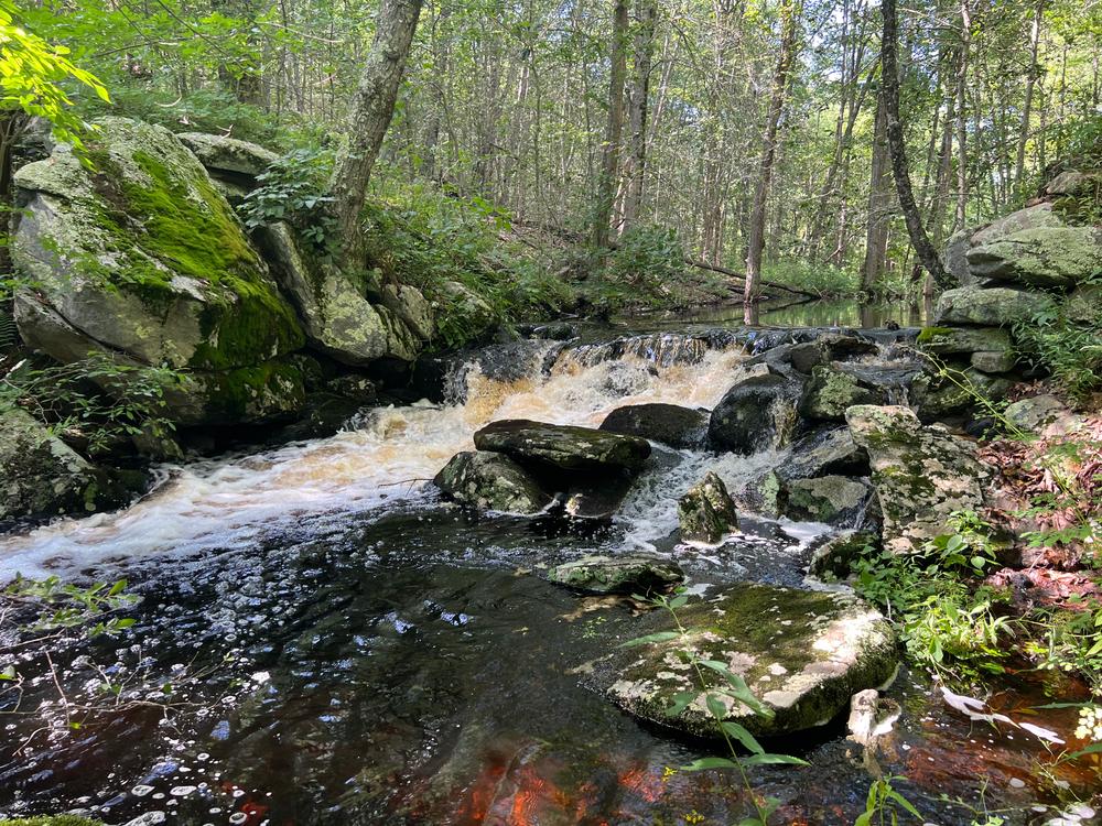 Following the path north, the trail crosses a stream (which soon joins the Iron Stream). There is a fine step-stone crossing here. This section of trail passes through a managed private forest that recently was harvested. Further on, the trail passes along the Iron Stream, then over two rocky outcrops before it descends to the old iron smelter works. The trail ends here, at the dam site (0.8 miles from the trailhead). A monument describing the site was placed here in 1989 by the MLCT and the Madison Historical Society.