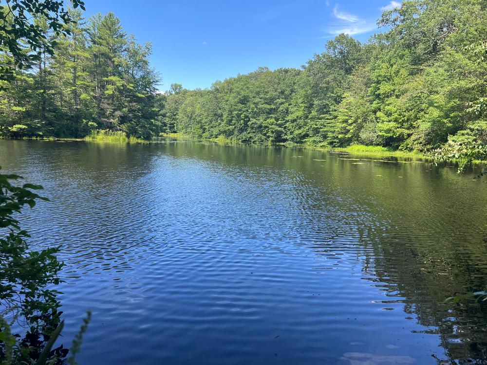 Return along the trail to the junction and, for variation, take the fork (straight ahead to the south). The trail ascends and descends the ridge (by several homes), passes along a wetland to the east, and through a laurel thicket. Just before an old fence line marking private land, the trail turns sharply left (east), crosses the stream that drains the wetland, and soon rejoins the trail leading back to the trailhead.