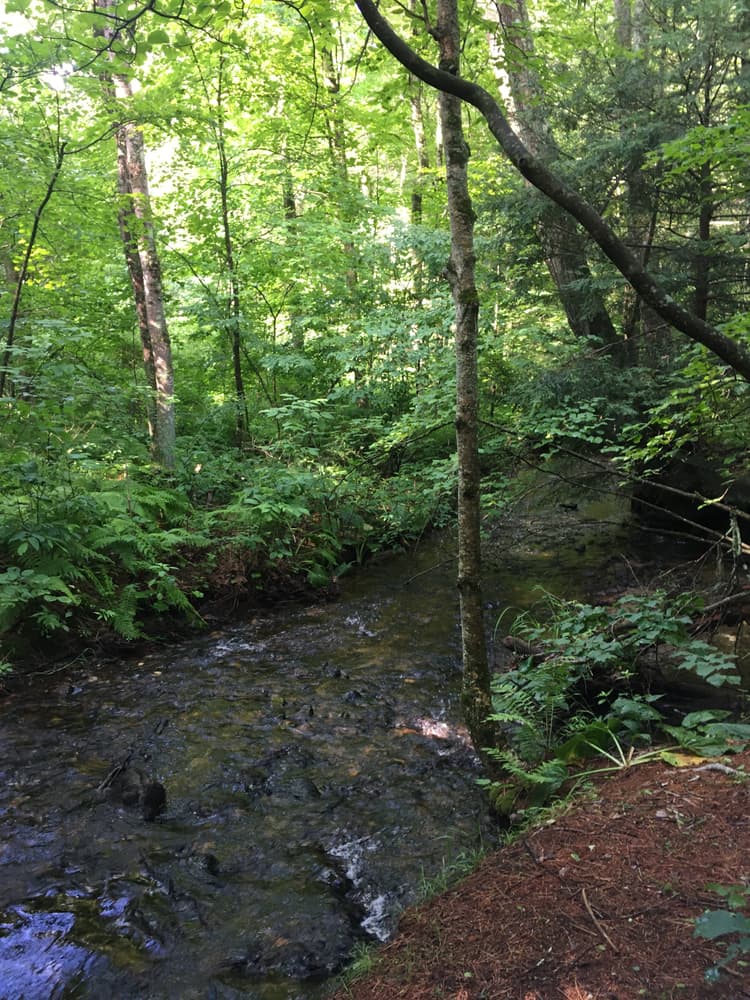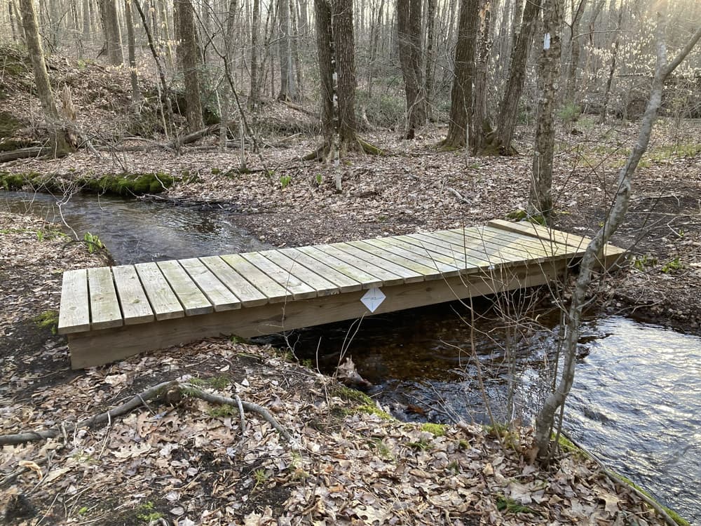 The White Trail heads southwest from the western parking lot, along a mountain laurel patch descending to Kimball Brook. After crossing Kimball Brook over a bridge, it winds east along the banks of the brook with several small babbling water cascades. At the next bridge over Kimball Brook, hikers can connect to the Peach Trail, or cross the bridge and loop back to the parking area on the White Trail.