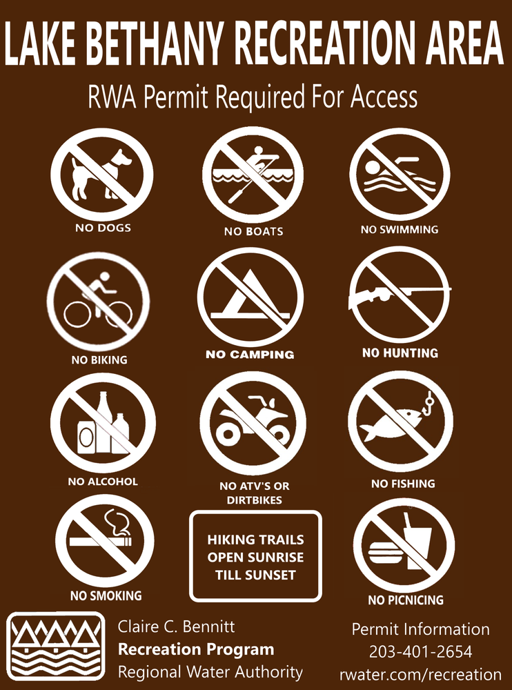 The Lake Bethany gated entrance and parking area is located along Hatfield Hill Road adjacent to the overhead power lines which can be reached via the Litchfield Turnpike (Route 69).