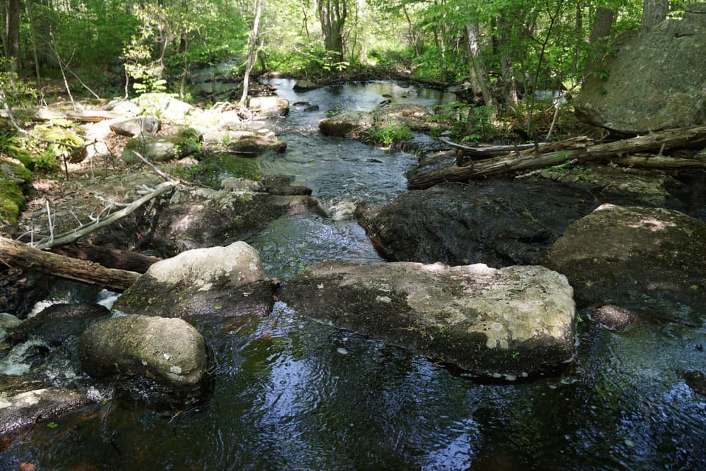 The terrain of the Menunkatuck Trail is rolling, with little to no steep climbing, and consists of rocky wooded ridges, inland wetlands, scenic meadows, and residential areas. Notable features include Timberland Preserve’s Upper Lake and the beautiful haying fields of East River Preserve. The Menunkatuck also has the distinction of being the only Connecticut Forest and Park Association (CFPA) trail to pass directly through a train station!