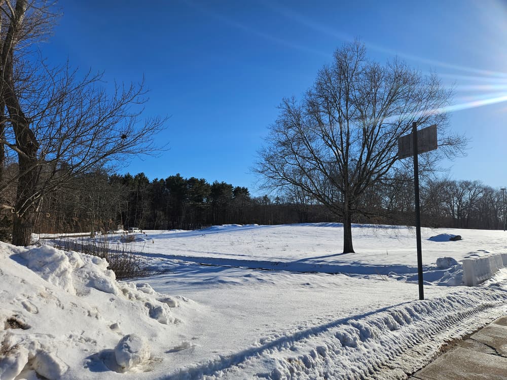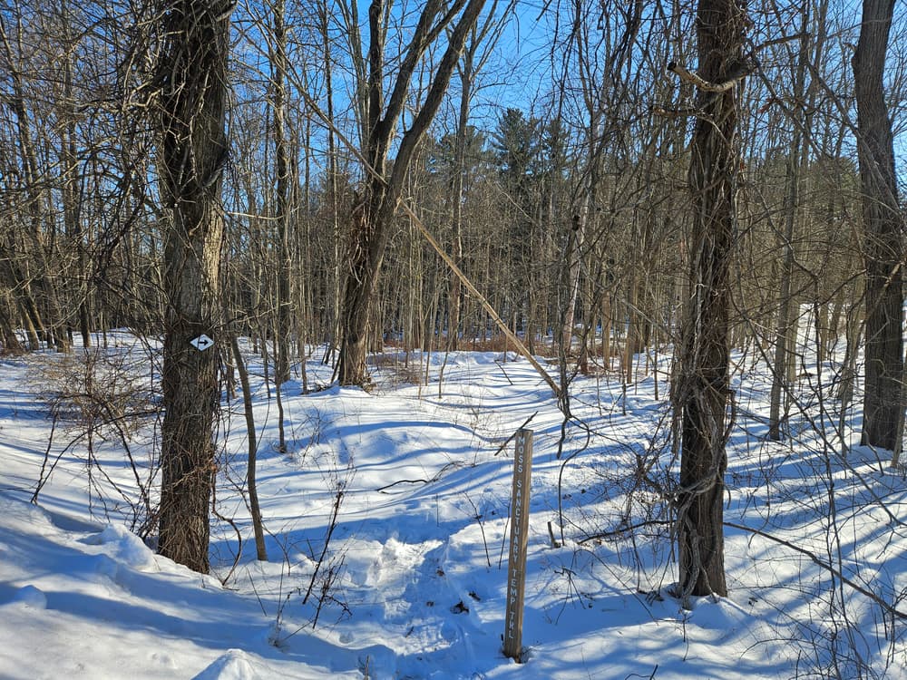 The trail then descends the hill; a spur trail to the left leads to Knollwood Apartments. Following the loop to the right takes the travelers across a brook and to a vernal pool where frogs and salamanders lay eggs in spring. The loop continues past Mansfield Apartments and through a former dense grove of red pines which have since died. Young trees are growing in to replace them, along with invasive plants such as barberry and autumn olive.