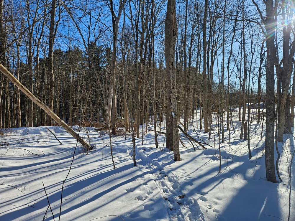 From the parking area on the east side, the trail joins the larger 1.3-mile perimeter loop. Turning left leads uphill to seasonal views over Tift Pond. The trail crests the hill and travels through a former farm field where native and non-native tree and shrub species - habitat for many birds and wildlife - are gradually re-establishing forest. As the trail reenters mature oak-hickory forest, the perimeter loop continues to the right. The property's highest elevation (700 feet) is found at the west side of the loop and features a grove of eastern hemlocks, which favor a cool, humid climate.