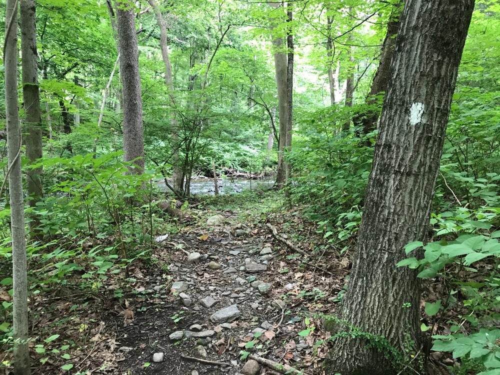 Maple trees, some larger-sized black birch trees, sycamores, and stands of black locust and ash dominate. The gentle, nearly flat riverside topography gives way to a stunning steep-sided ravine. The trail ends at the top of the ravine.