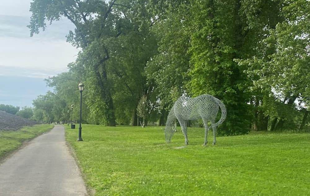 Heading south along the river, the trail passes the Colt Dome and arrives at its southern end in Charter Oak Landing. Just south of Downtown Hartford, this park is home to a pair of nesting eagles, and features amenities such as a public boat launch, fishing access, playground, picnic tables, seasonal port-o-lets (Memorial Day to Labor Day), pet waste station, charcoal grills, and bike racks. There is also access to the Charter Oak Bridge pedestrian walkway, linking back to the East Hartford Riverwalk. This section includes spectacular city views and the Lincoln Sculpture Walk while traveling north past the confluence of the Connecticut and Hockanum Rivers though the floodplain and returning to Great River Park.