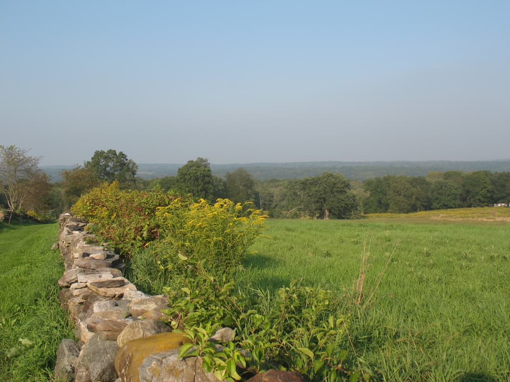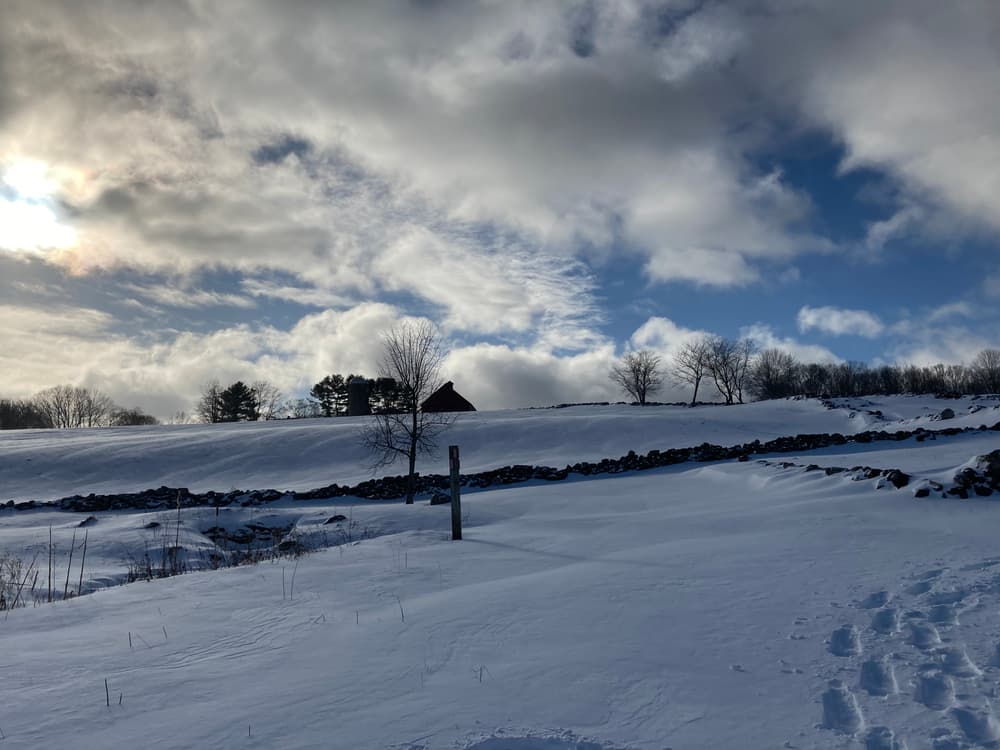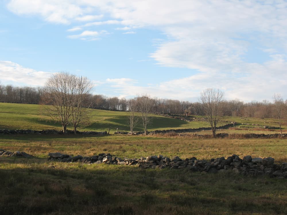 The trail encircles the agricultural fields with a beautiful eastward view. A portion of the upper trail follows the former cow path lined with old stone walls. It continues through woodlands and links with the Hop River State Park Linear Trail