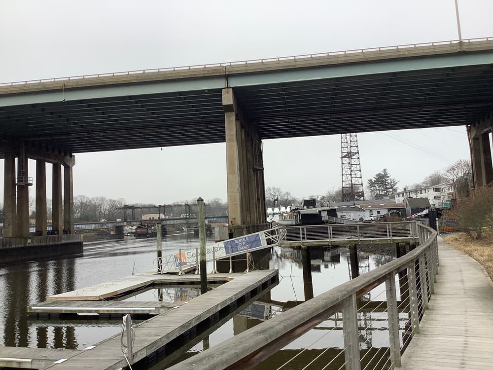 This area, previously an active commercial lot and oil depot, was redeveloped in 2010 with retail stores and restaurants. A boardwalk along the river's edge provides views of the I-95 bridge and Bridge Street bridge along with a picnic area. Limited public parking is available.