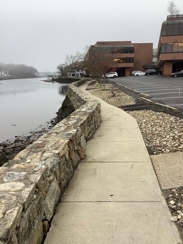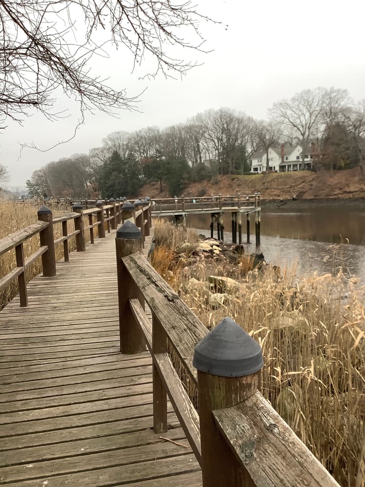 The walkway starting at 355 Riverside Avenue runs behind corporate buildings along the Saugatuck River. It connects with a walkway to a nearby restaurant, providing a beautiful continuous path with other sites. The boardwalk crosses over marsh habitat and extends into the river in two places where there is plenty of bench space with scenic views. Bring a bag lunch, come to fish, or just enjoy the area. Parking is available at Riverside Avenue. Behind 325 Riverside Avenue, two piers provide sitting areas overlooking the marsh and the water. Behind 301 Riverside Avenue, the elevated boardwalk overlooks the Saugatuck River. The walkway continues along the edge of the Saugatuck River behind the corporate building at 285 Riverside Avenue. This wall edge allows for fishing and sitting with a view of the river's activities.