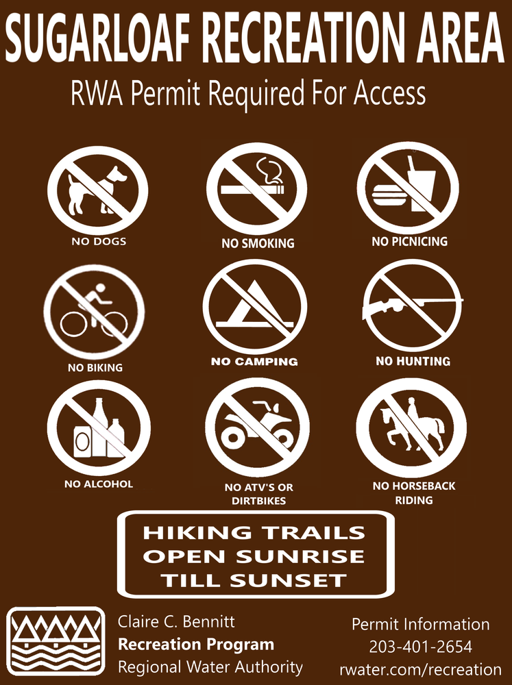 Sugarloaf’s gated entrance and parking area is located on West Street. Take Foxon Road/North Branford Road (Route 80) to County Road (West Street) near the North Branford town line to the left fork to West Street.