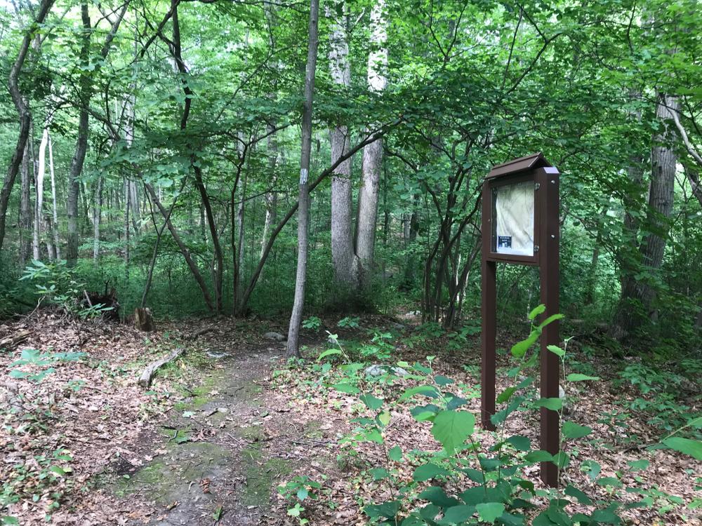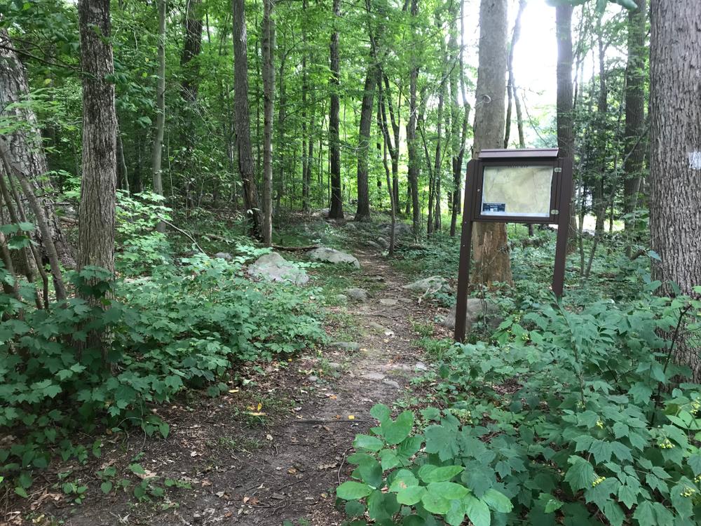 From the Bald Hill Road entrance, the hiker immediately enters a second growth deciduous woodland flanked by residences. The entrance to the bulk of the property is marked by crossing over a stone wall. This site has many stonewalls which give evidence to the past agricultural uses. The wall crossing marks a "T" intersection for the perimeter trail.