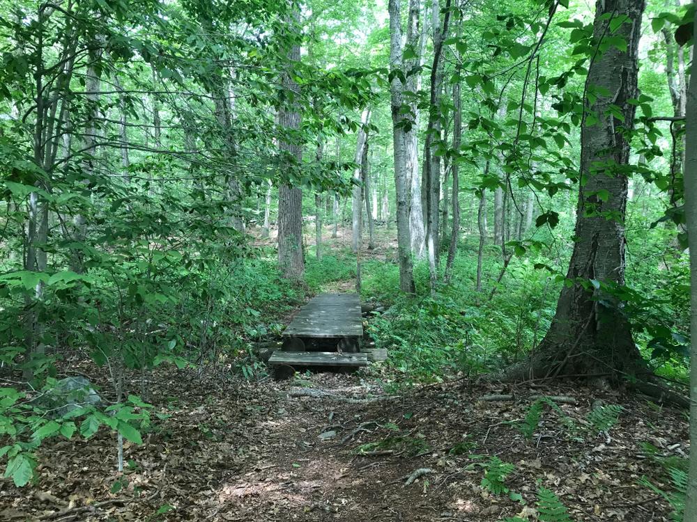 The Vista Road entrance provides access to the site over Wilton Land Conservation Trust property. This trail brings the hiker to the loop trail past the southeastern wetland and over a brook.