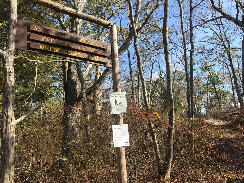 White Cedar Swamp & Deans Mill Farm Preserve offer a scenic lollipop loop trail along the Mystic Reservoir. Marked with dark blue trail head and trail blazes, the packed earth/dirt trail is 1 mile in length with an elevation change of 105 feet. Rated at an easy difficulty, the trail ranges from 2-3 feet in width to very broad. It provides great opportunity for bird watching, with occasional small wildlife, several large rocks and stone walls.